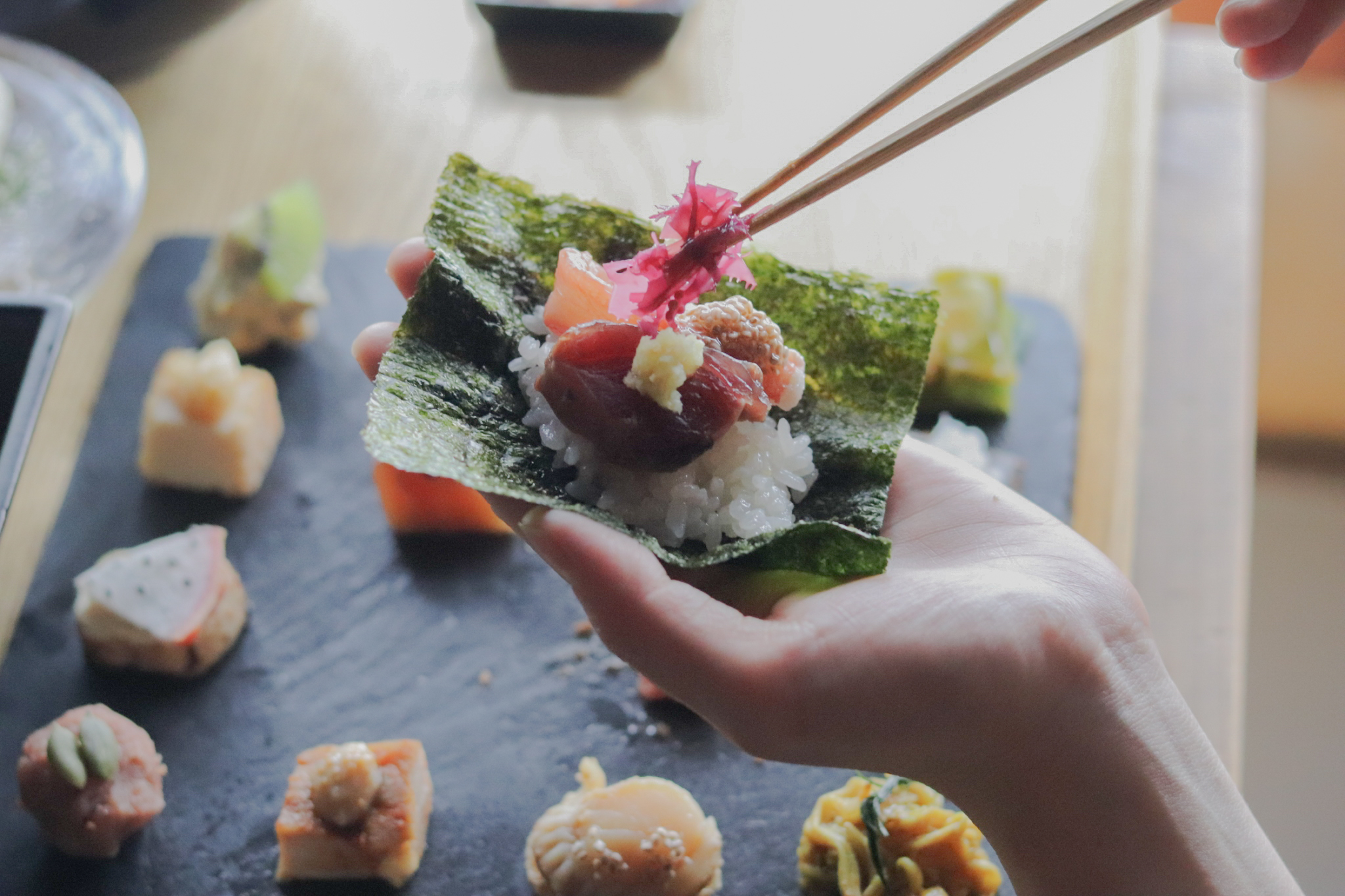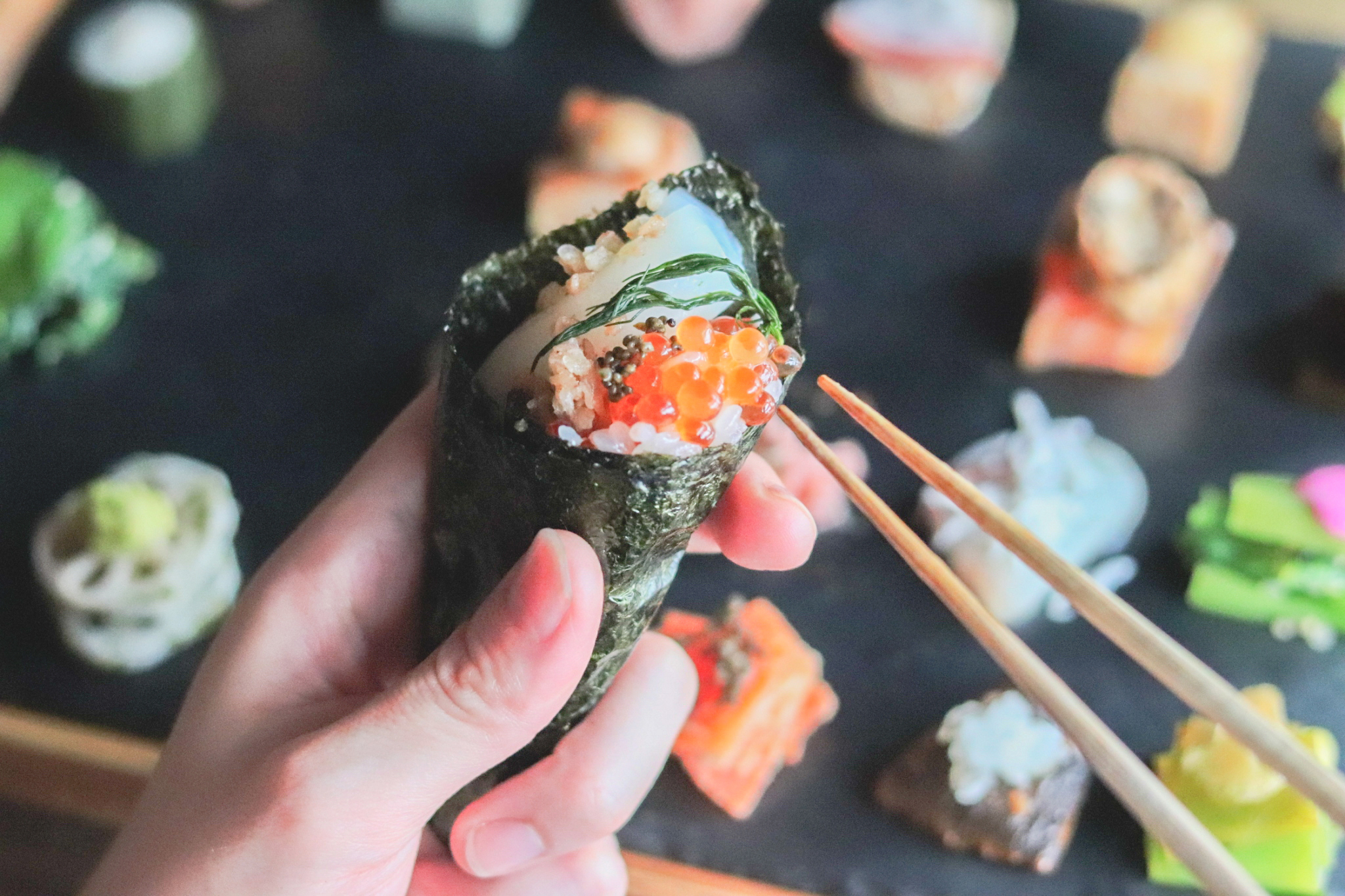 数十種類もの素材を少しずつ織り重ね、自分の手で巻く一口には、季節の移ろいや味わいの変化が詰まっています。