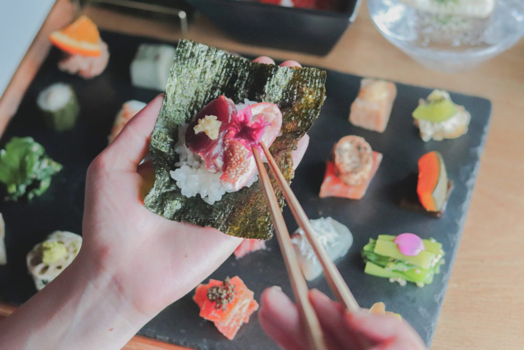 AWOMB烏丸本店では、京都の食材を中心とした色とりどりの季節の食材をお客様ご自身の手で自由に織り交ぜて、オリジナルの手巻き寿司を作っていただく「手織り寿し」をお楽しみいただけます。